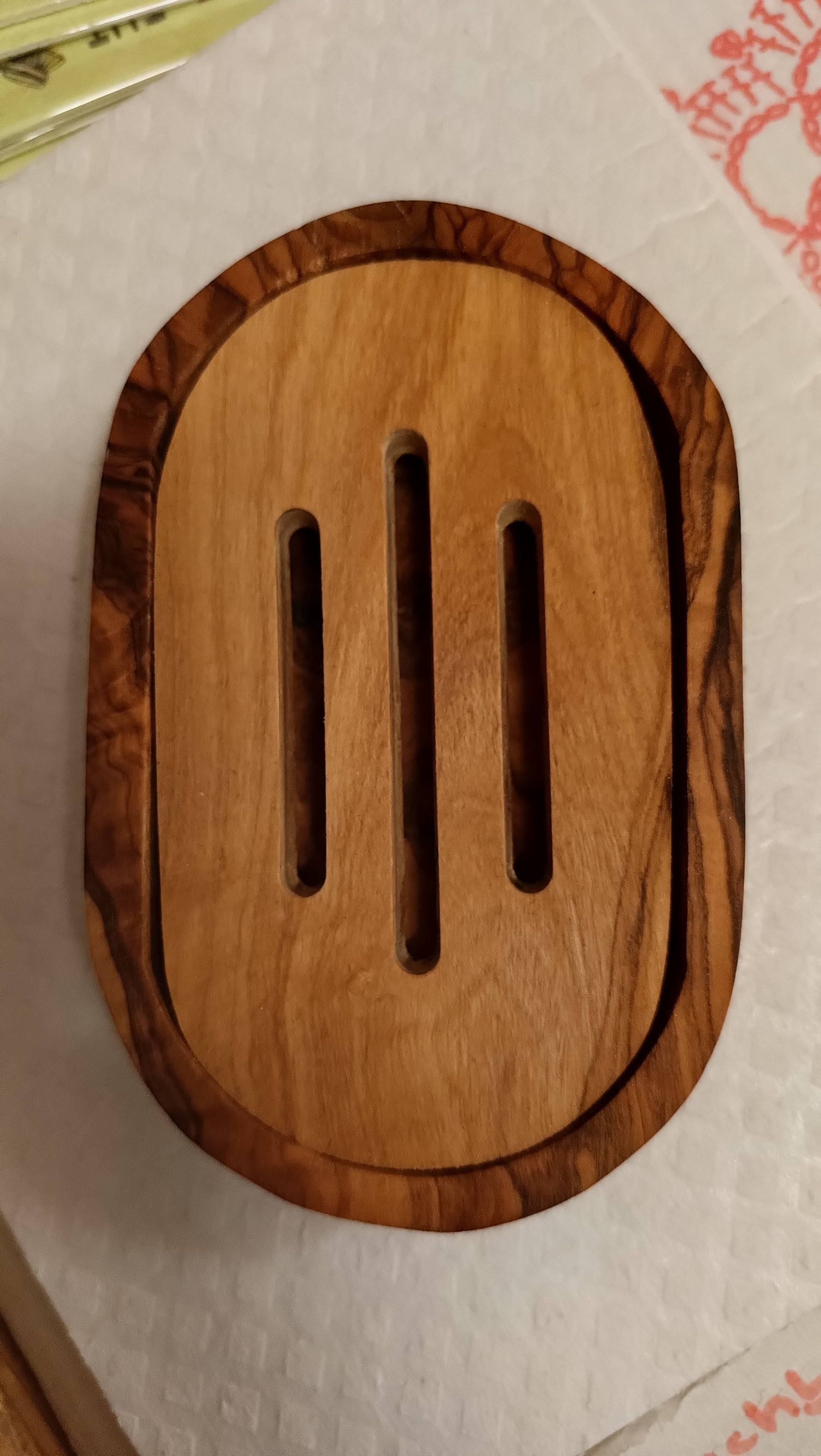 Die klassische Seifenschale. Sie ist schön anzusehen und passt eigentlich für alle handelsüblichen Seifen. Das Olivenholz weist eine besonders schöne Maserung auf und macht jede Schale zu einem Unikat.
