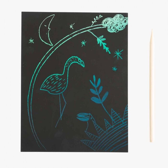Per sviluppare creatività e fantasia, set di 7 gratta e vinci neri e 1 penna in legno. Disegnando con la penna sul cartoncino nero, il colore diventa visibile. Il set da notte contiene 7 carte sfumate: 4 blu e 3 verdi.